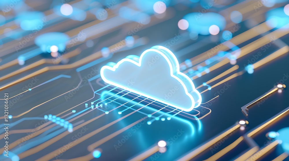 Wall mural neon cloud icon on futuristic circuit board background representing digital cloud computing technolo - Wall murals Wall mural neon cloud icon on futuristic circuit board background representing digital cloud computing technolo - Wall murals