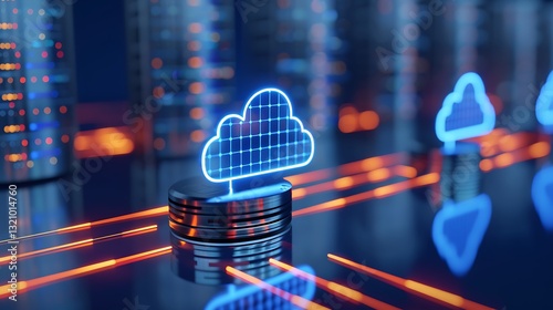 Wall mural : Neon cloud icon with data flow on modern digital background for technology and innovation concepts