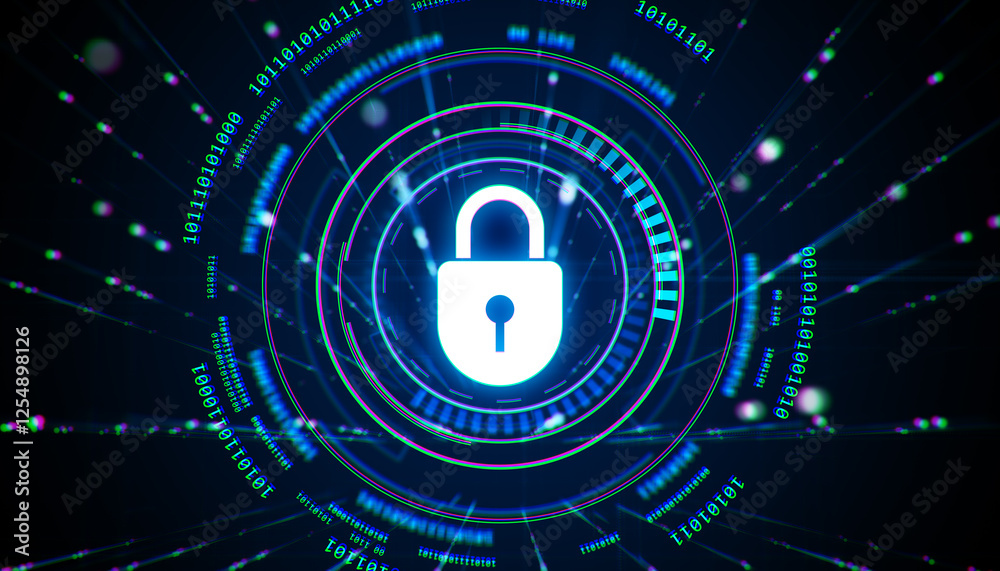 The watermark will not be included on Wall mural.: Neon glowing padlock icon surrounded by binary codes on a futuristic dark digital background - 3d ren