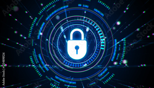 Wall mural neon glowing padlock icon surrounded by binary codes on a futuristic dark digital background. 3d ren