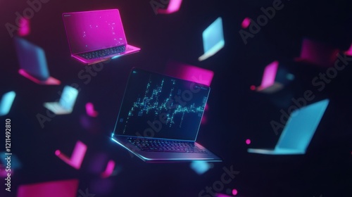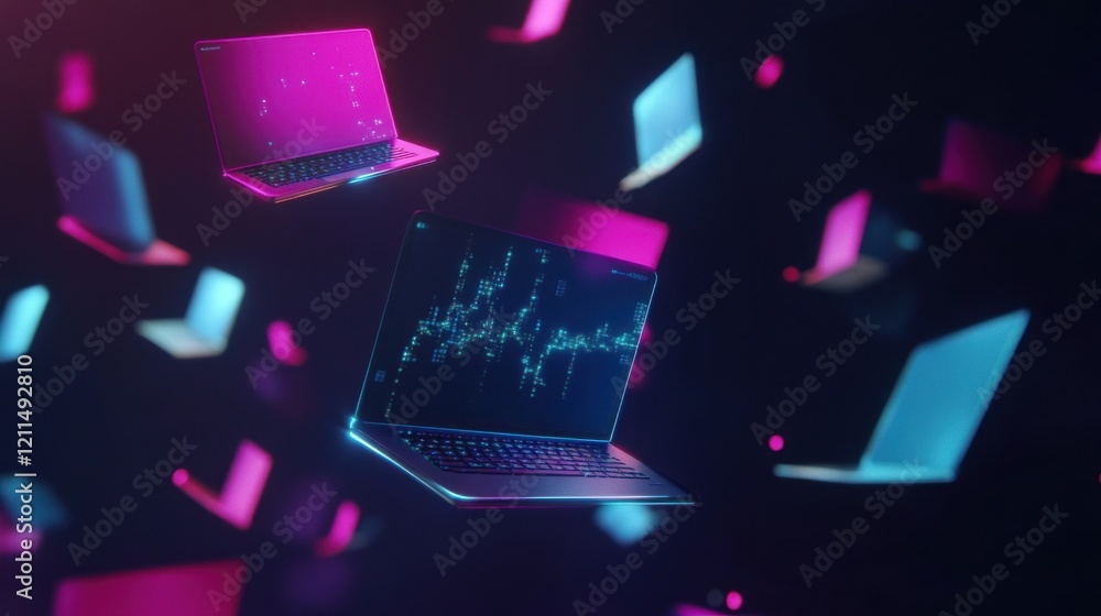 Wall mural neon laptops floating in cyberspace: a digital network visualization