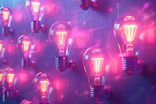 Wall mural : Neon light bulbs in colorful array highlighting creative thinking and modern design
