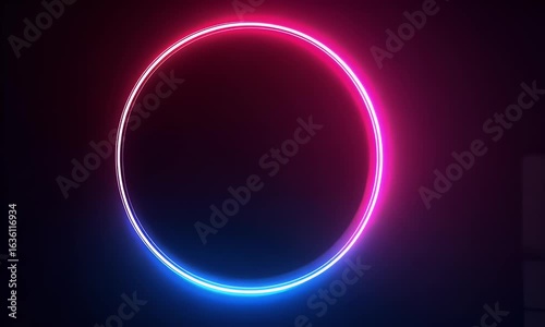 The watermark will not be included on Wall mural.: Neon light effect with a glowing circular frame on a dark background, blue and pink neon lines in th