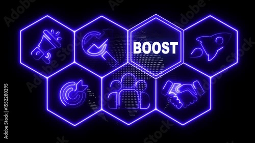 Neon line boost concept button on a futuristic computer screen display with hexagon shapes and scienWall mural