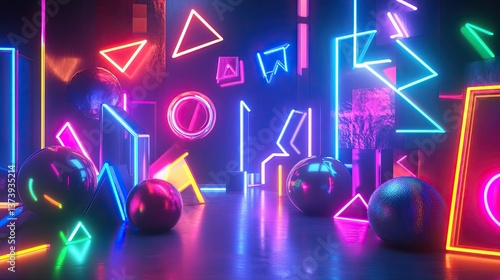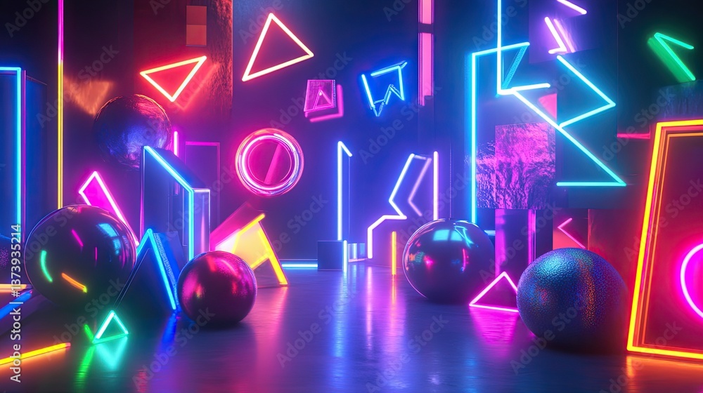 The watermark will not be included on Wall mural.: Neon-lit 3d objects over a bold 2d flat design background, blending styles for a high-energy visual -