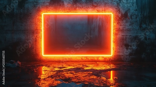 The watermark will not be included on Wall mural.: Neon orange rectangular frame radiating a warm glow set against a rough dark concrete background cre