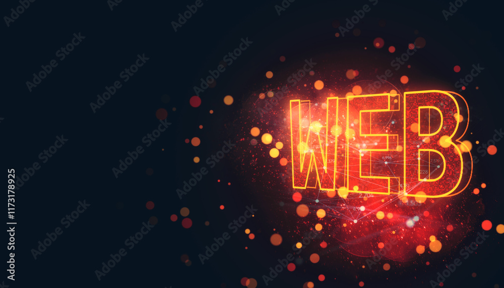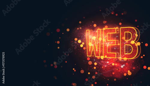 Neon orange "web" text glowing with bokeh lights and digital network elements on dark background - 3dWall mural