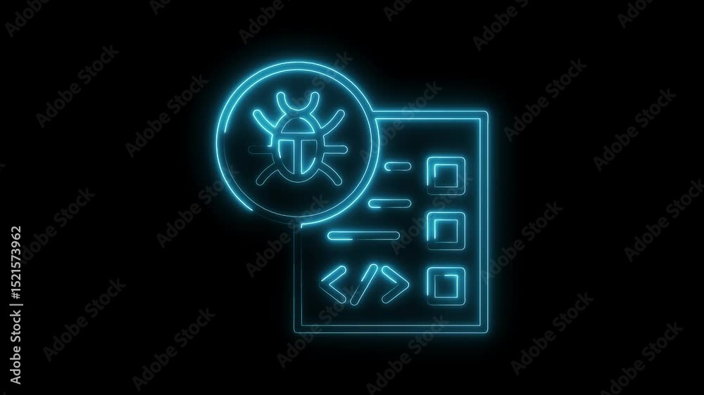 Wall mural : Neon outlined coding bug and script icon on black background for software development