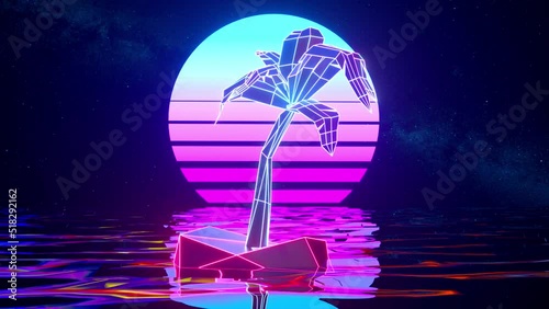Wall mural neon palm tree on a retro background. water surface. blue pink color. 3d animation of seamless loop