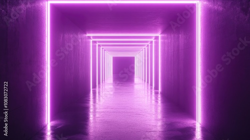 The watermark will not be included on Wall mural.: Neon rectangular frame with horizontal lighting tunnel corridor background featuring geometric glow