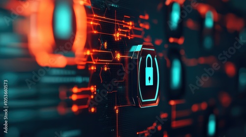 Neon shield icon hovering over a blue circuit board design with digital patterns with copy spaceWall mural