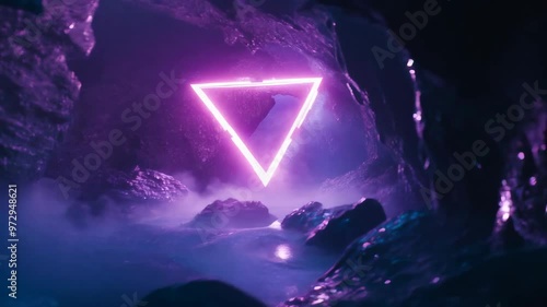 The watermark will not be included on Wall mural.: Neon triangle glowing in the fog inside a dark cave
