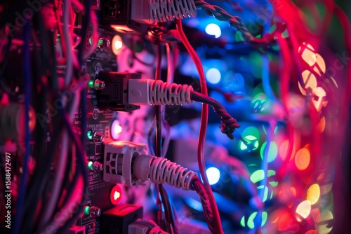 The watermark will not be included on Wall mural.: Network attached storage nas drive with ethernet cables and flashing led lights in a data center