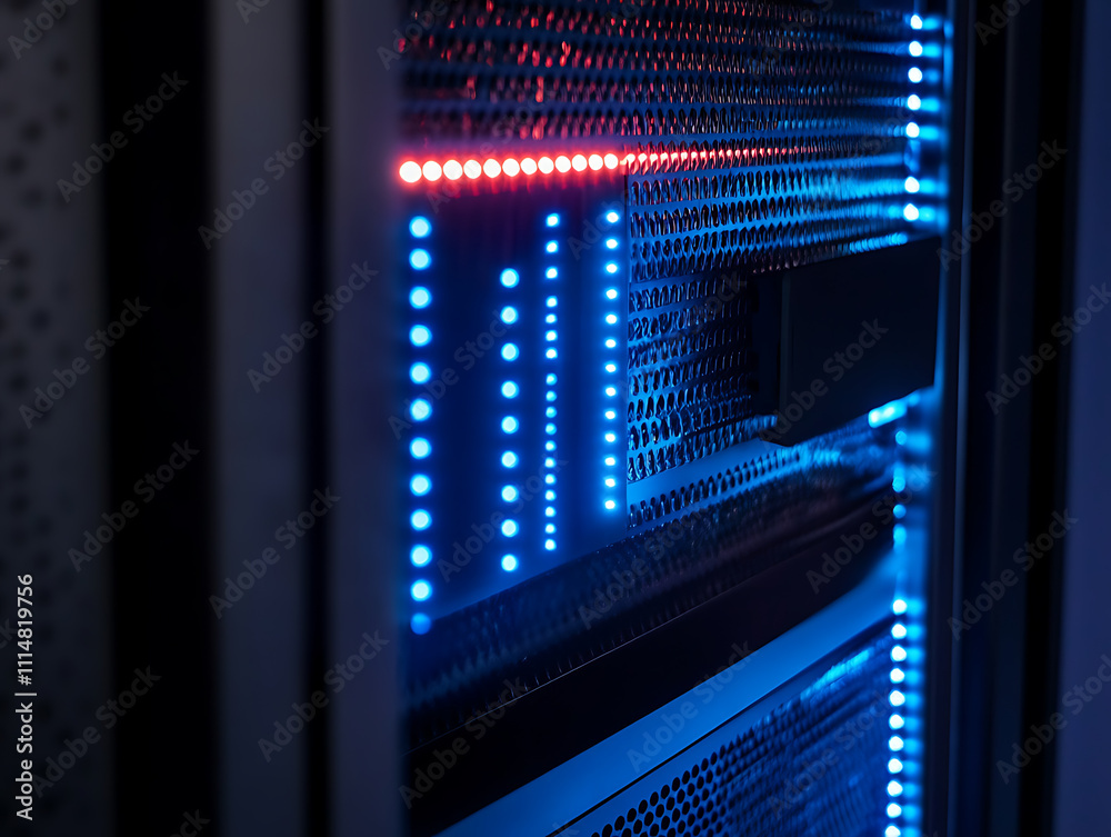 Network switch and ethernet cable in rack cabinet, network connection technology and has a status leWall mural