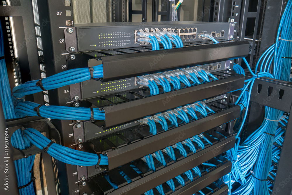 Wall mural network switch and ethernet cables in rack cabinet, computer and information network system technolo - Wall murals Wall mural network switch and ethernet cables in rack cabinet, computer and information network system technolo - Wall murals