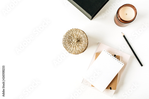 Wall mural neutral minimal office desk workspace with notebook on white background. flat lay, top view.