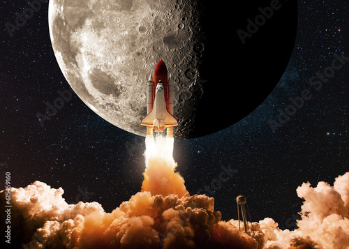 Wall mural : New space shuttle rocket with smoke and clouds takes off into the sky with moon - shuttle spaceship l