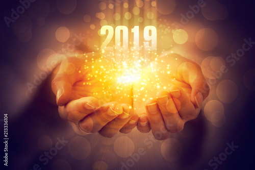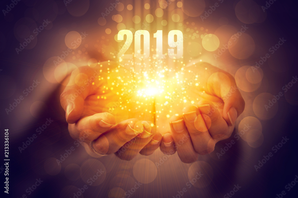 Wall mural new year 2019. magic energy emanating from women's hands. dark background with bokeh and a flash of