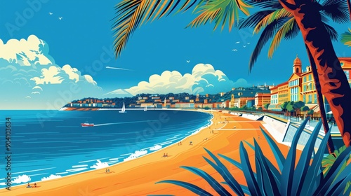 The watermark will not be included on Wall mural.: Nice landmarks, promenade des anglais and castle hill, france, minimal flat design illustration, no