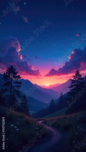 Wall mural night's gentle beginning twilight hues paint the sky as darkness descends, stars start to appear, an - Wall murals Wall mural night's gentle beginning twilight hues paint the sky as darkness descends, stars start to appear, an - Wall murals