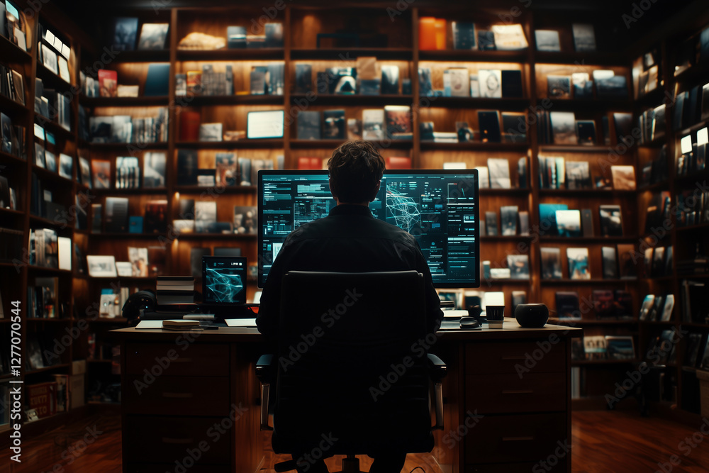 The watermark will not be included on Wall mural.: Night coder: a programmer working late in a modern library-style office, surrounded by books and scr