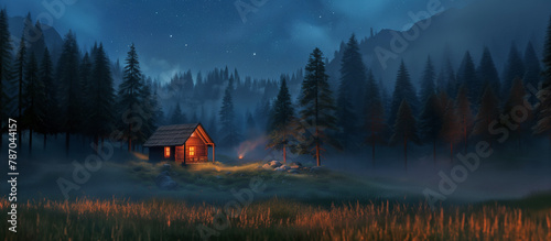 The watermark will not be included on Wall mural.: Night landscape with a starry sky and a small lonely cabin in the mountain forest