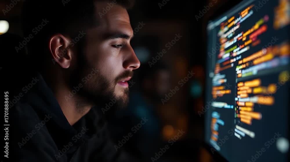 Night programmer: a focused individual immerses himself in the digital realm, illuminated by the sofWall mural