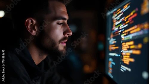 Wall mural : Night programmer: a focused individual immerses himself in the digital realm, illuminated by the sof