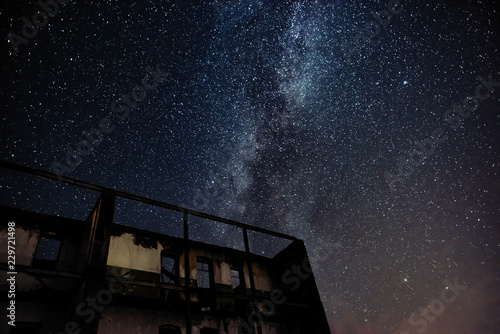 The watermark will not be included on Wall mural.: Night sky and the milky way over the old abandoned house