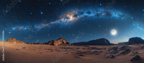 Wall mural : Night sky panorama showcasing a vibrant milky way arching over a desert landscape with distant mount