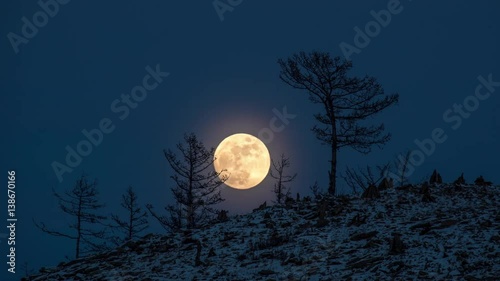 The watermark will not be included on Wall mural.: Night time lapse large full bright moon rises from above hill into sky -