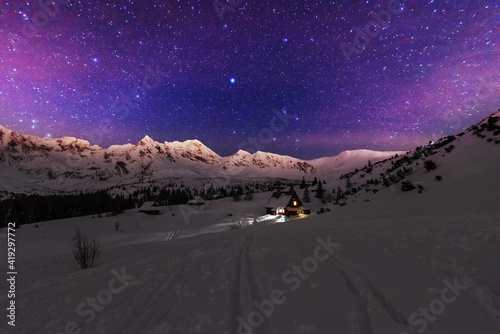 Wall mural night winter landscapes in the high tatras, with mountain houses on a background of snow-capped moun
