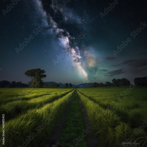 Wall mural nighttime splendor: milky way shining brightly above a serene paddy field created using generative a - Wall murals Wall mural nighttime splendor: milky way shining brightly above a serene paddy field created using generative a - Wall murals