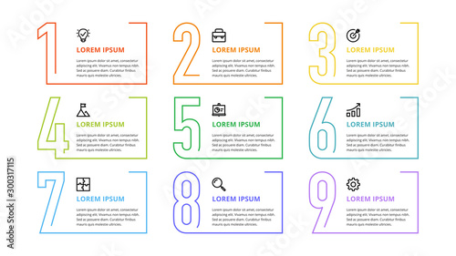 The watermark will not be included on Wall mural.: Nine colorful numbers or figures and rectangular elements or cards with place for text - infographic