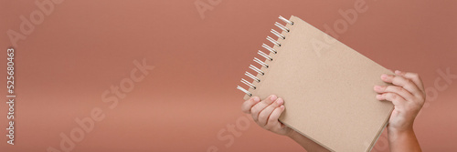 Wall mural notepad in hand. blank notepad in the hands of a child on a red background. hands hold a book withou