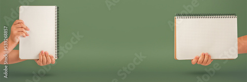 Wall mural notepad in hand. blank notepad in the hands on a green background. hands hold a book without text. t