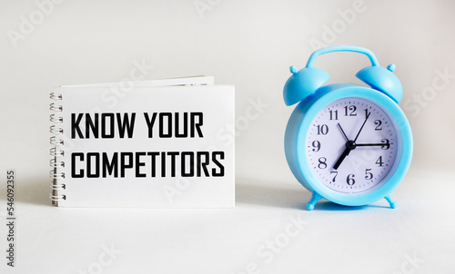 Wall mural notepad with text know your competitors with clock on white background. business concept.