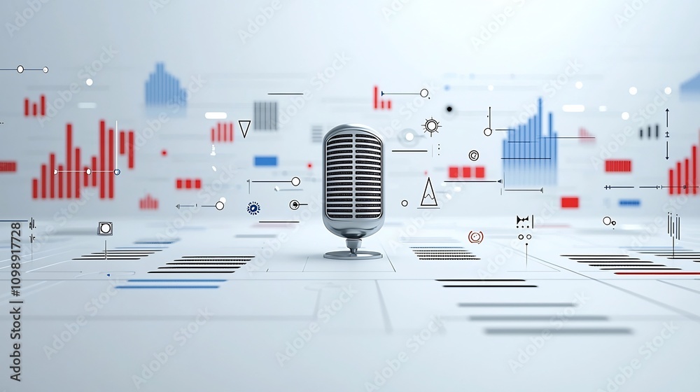 The watermark will not be included on Wall mural.: Of voice concept with speaker surrounded by precise sound wave graphics and storytelling imagery on