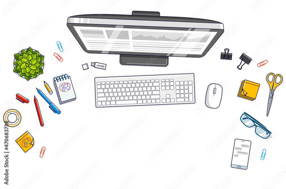 Wall mural office desk workspace top view with pc computer and diverse stationery objects for work isolated, ov - Wall murals Wall mural office desk workspace top view with pc computer and diverse stationery objects for work isolated, ov - Wall murals