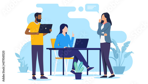 The watermark will not be included on Wall mural.: Office talk at desk - team of businesspeople working with computers having conversation and dialogue