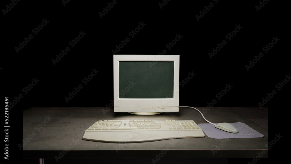 Wall mural old dirty computer monitor sitting on a dark table on a black background. with a vintage mouse, mous