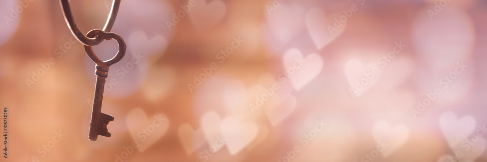 Wall mural old rusty vintage key in the shape of a heart, panoramic bokeh background with copy space. love and