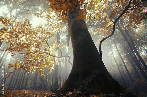 The watermark will not be included on Wall mural.: Old tree with twisted roots in a misty forest in autumn