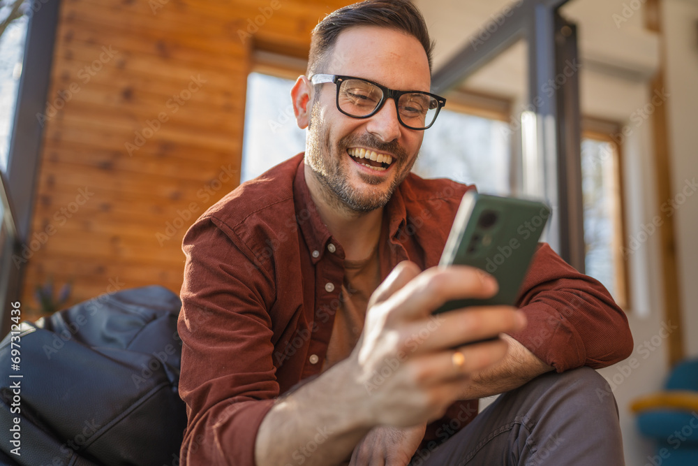 The watermark will not be included on Wall mural.: One adult man at home use smart phone app browse internet or send sms