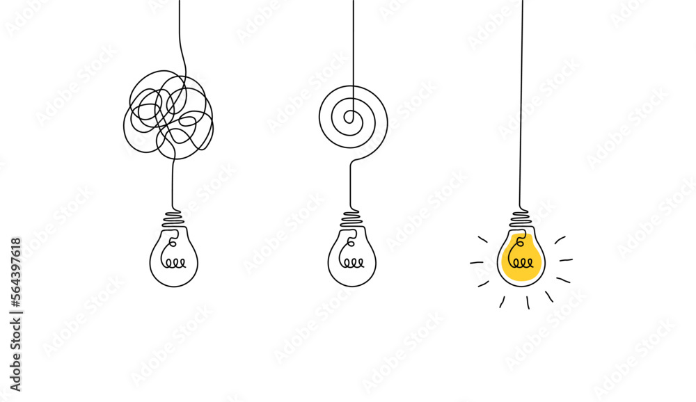 Wall mural : One continuous line drawing of tangled and scribble wires with light bulbs - concept of complex probl