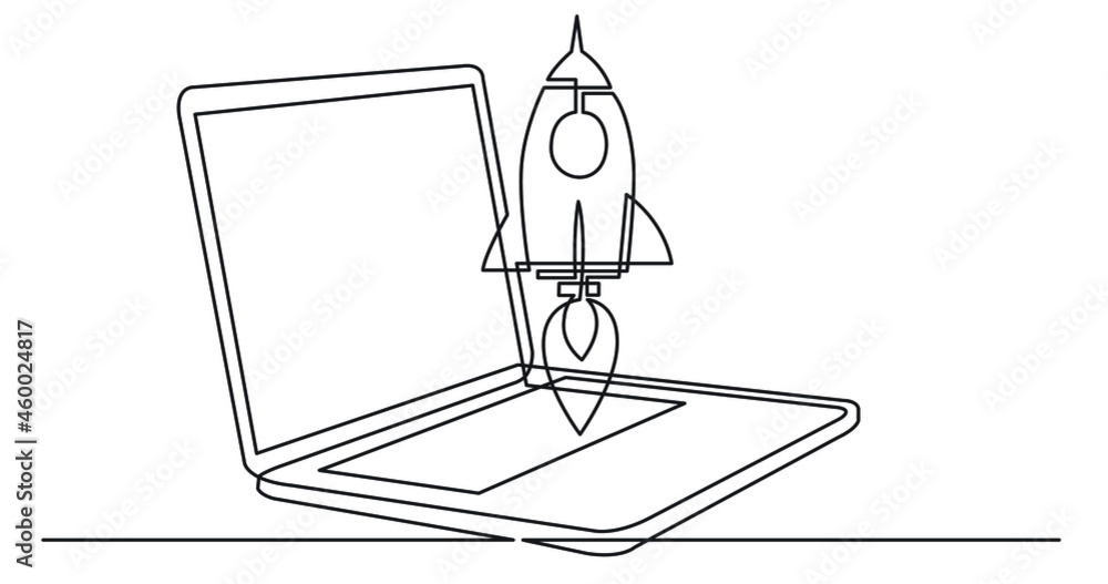 Wall mural one line drawing of laptop computer with rocket launch as business concept of startup - Wall murals Wall mural one line drawing of laptop computer with rocket launch as business concept of startup - Wall murals