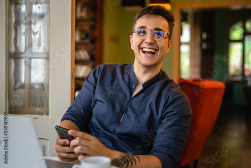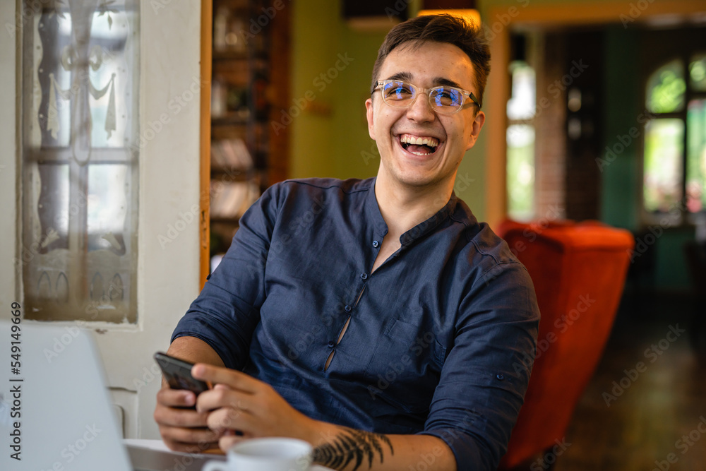 The watermark will not be included on Wall mural.: One man using mobile phone typing sms send messages online while sitting at the table with laptop co