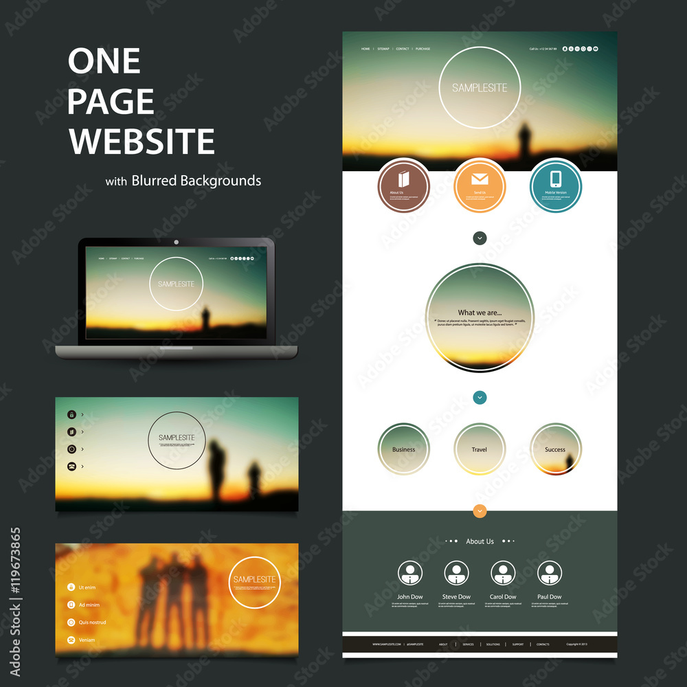 Wall mural one page website template and different header designs with blurred backgrounds