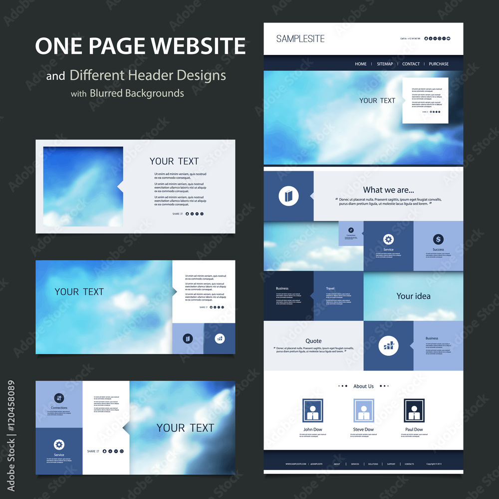 Wall mural : One page website template and different header designs with blurred backgrounds