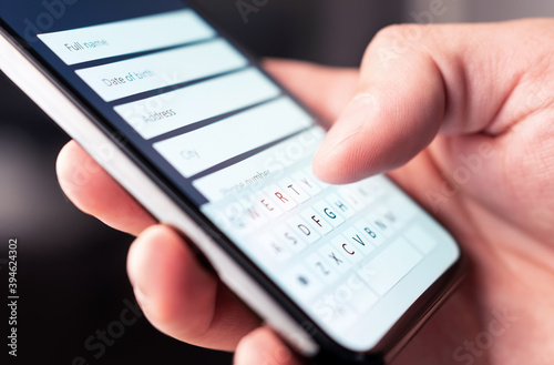 Wall mural : Online form to register personal info and data to web site with mobile phone - person typing informat